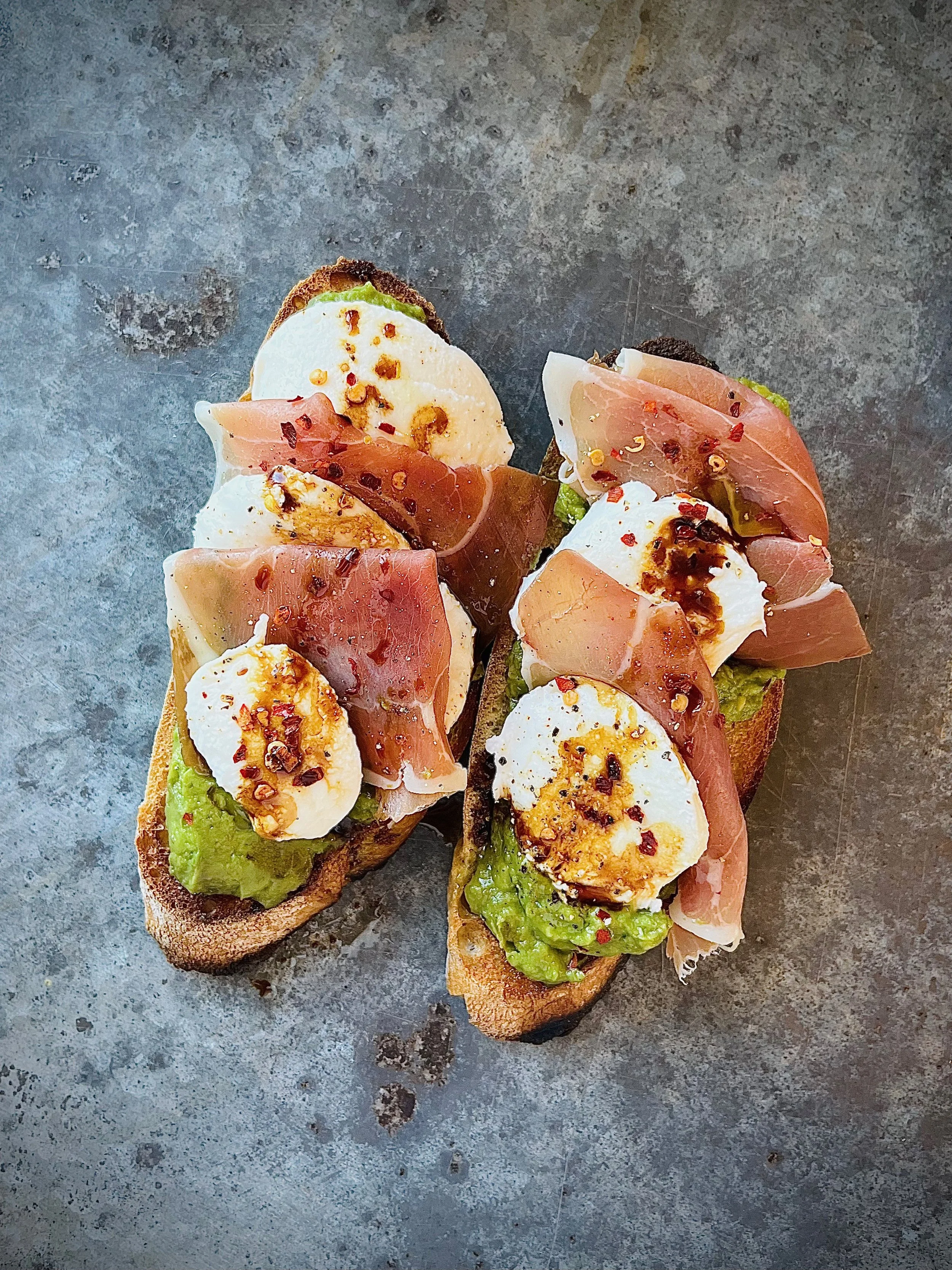 Ha guacamole på skivene og legg over skiver av fersk mozzarella og parmaskinke. Topp det hele med Balsamico og extra virgin olivenolje.
